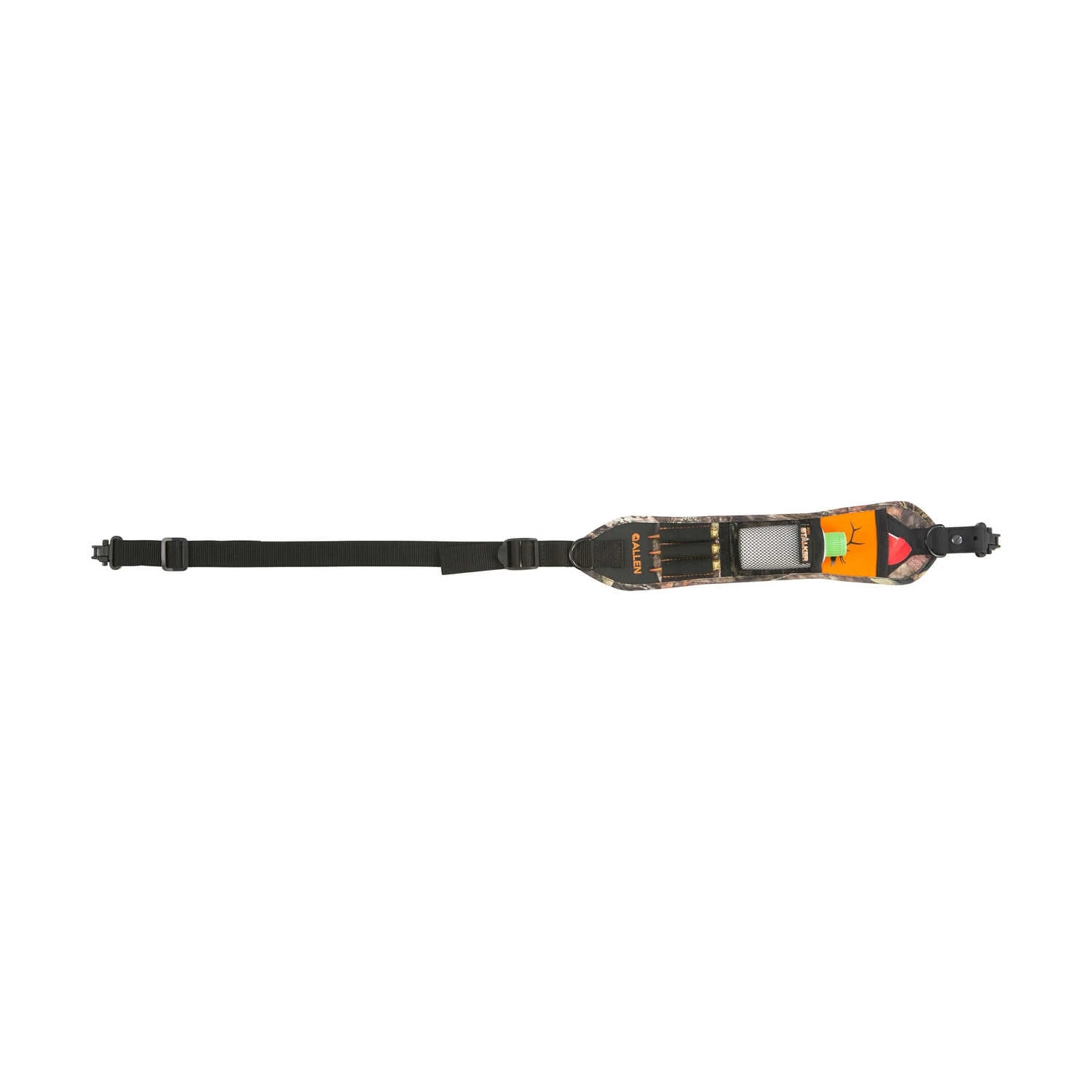 The Hypa-Lite™ Bull Stalker™ Rifle Sling is designed with the Elk Hunter in mind. Constructed with ultra-durable and lightweight Hypalon and molded with low-density foam and features a non-slip backing. The front of the sling features Mossy Oak® Mountain Country® camo with blaze orange accents in quiet fabric and engineered with stretch mesh pockets for your windicator and diaphragm calls, plus three spare cartridge loops. The body of the shoulder pad is 14-inches long by 3.25-inches wide, and the adjustable web sling is 1-inch wide. Includes D-rings to attach accessories and an adjustable ladder lock buckle and Swivels tested to hold up to 500 pounds.