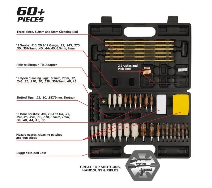 - ALL-IN-ONE: Gun cleaning kit features 60-pieces to keep your guns performing at their best so you can shoot more & clean less.