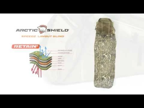 ARCTICSHIELD SPEEDZ LAYOUT BLIND IN REALTREE MAX-5 CAMOUFLAGE • Durable 600D PU polyester • Packable, compact, and portable • Retain™ heat retention technology in backrest, mat, and cover • Zippered rear storage pocket • Adjustable head pillow • Vegetation straps • Heavy-duty aluminum frame •