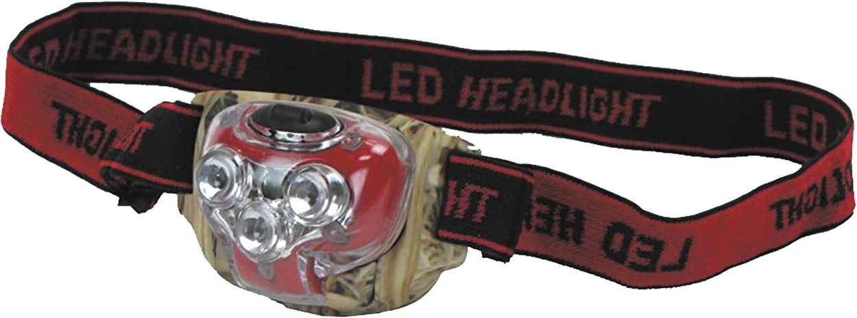 Mossy Oak 4 LED 90 lumens headlight can put light where you are looking. A comfort stretch headband with adjustable angle holds this powerful head lamp pointed in the right direction. 3 functions; white high beam, white low beam, red for night vision. Mossy Oak 90 Lumens Head Lamp