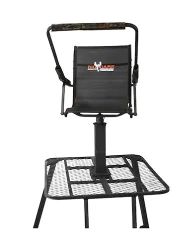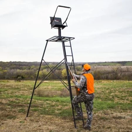 The steel constructed Defender Tripod by Big Game, measures 12.5” tall from the ground to the shooting rail, and a full ladder for easy entry. The platform measures 32”x32”. Padded, 40” high shooting rail and armrests that flip back out of the way. The Defender weighs 115 Lbs. and has a weight rating of 300 Lbs.