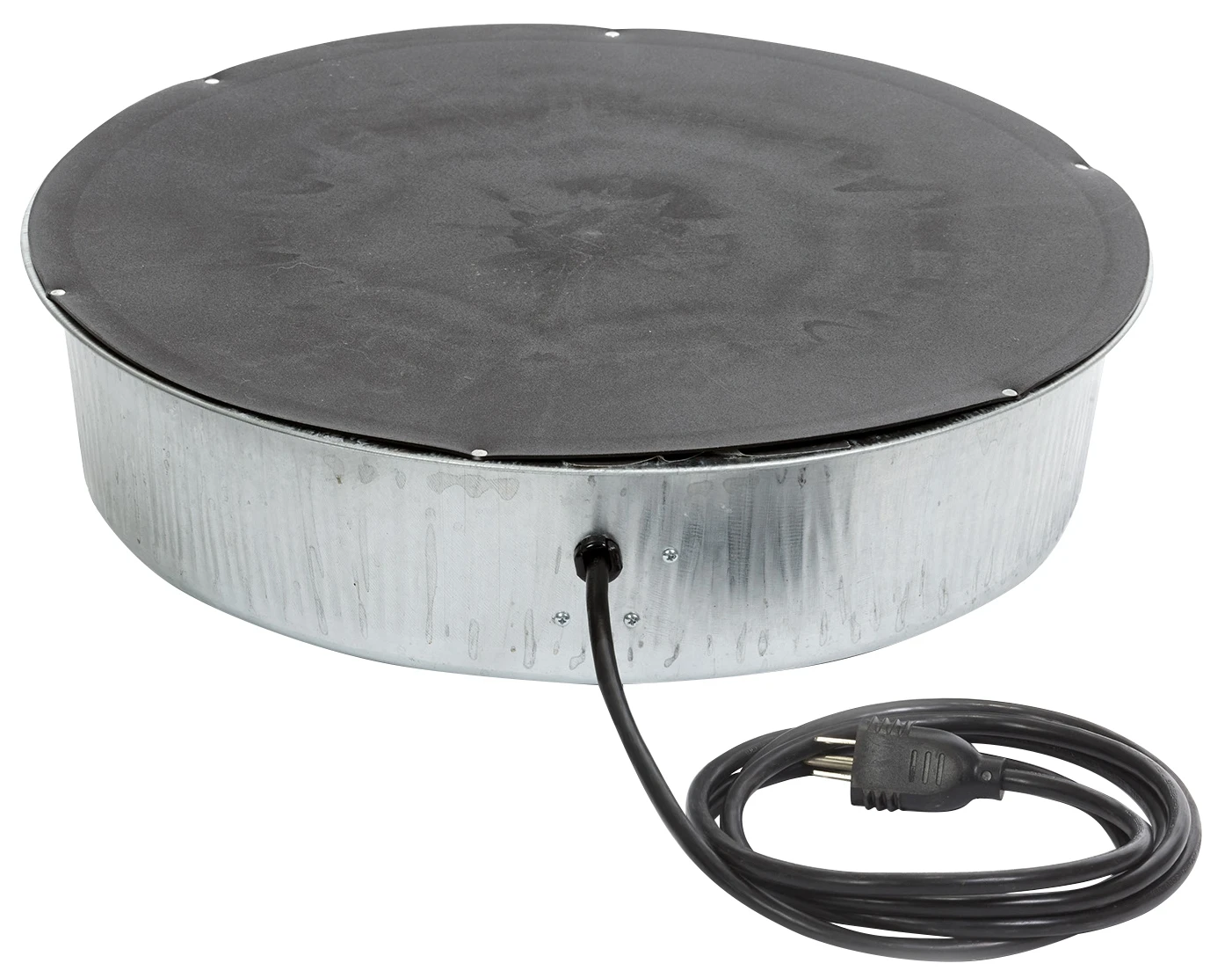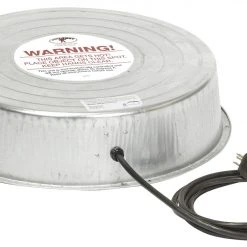 This Electric Heater Base helps prevent water from freezing in temperatures as low as 10 degrees F. Designed for use with Little Giant Double Wall Founts (Item Nos. 9832, 9833, 9835, and 9838, sold separately) and other all-metal containers. The heating element has been completely redesigned for improved safety and efficiency. The fully enclosed bottom adds another layer of protection. Perfect for unheated coops and barns; can be used outdoors in a dry, sheltered area. Made of heavy-duty, rust-resistant galvanized steel. Cord should be protected from animals and used with a Ground Fault Circuit Interrupter (GFCI) protected outlet. Unit will not draw electricity until temperature drops below freezing. Uses less than 1 amp per hour. 16.25 inch diameter by 3.687 inch high.