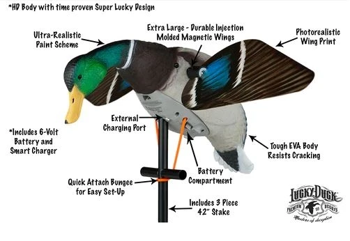 Those ducks won’t be able to pass up your spread when it’s equipped with our Super Lucky HD with Magnetic Wings. Our popular HD body style is now integrated into the time proven Super Lucky design with heavy duty motor. Extra-large, injection-molded magnetic wings sport lifelike paint schemes to add even greater realism to the flashing motion. Combined with a true-to-life body paint scheme, this decoy is sure to fool even the wariest of fliers. Tough EVA body resists cracking, so you can bring in birds for seasons to come. Equipped with an external charging port, quick-attach bungee that makes setup easy, 3 piece 42″ stake, 6-volt battery, and smart charger. HD Remote Kit ready – sold separately.