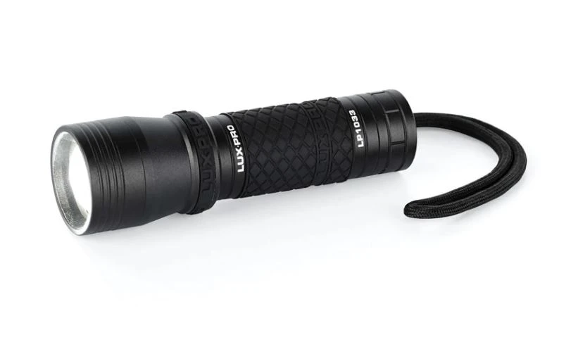 LUXPRO focus 350 lumen LED handheld flashlight with rubber grip. This is a compact flashlight that has a seamless push/pull focus head that is easy to adjust with 1 hand. With 3 lighting modes, users can get the light they need for any situation. Access 350 lumens on High and 100 on Low. The Low setting gives you an extended runtime of 11 hours. The hidden strobe can be accessed and exited by pressing the on/off button for approximately 3-4 seconds. Constructed with aircraft-grade aluminum making it extremely durable. This light is o-ring sealed and waterproof with an IPX4 rating. It operates on and comes loaded with 3 AAA alkaline LUXPRO batteries