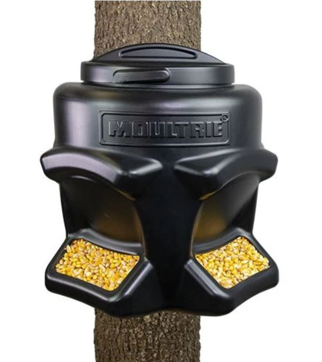 The Moultrie Feed Station II is based off of Moultrie’s popular Feed Station. The Feed Station II has been redesigned and upgraded with features that improve wildlife feeding and keep operation simple. The Feed Station II will hold a 50-pound bag of corn and now comes with dual feed ports. Each feed port features integrated rain shields and weep holes to keep feed dry. This gravity-style feeder can be used to feed corn, protein pellets, rice bran and any other type of wildlife feed. Another upgrade to the Feed Station II, is a new easy twist-on/twist-off lid. The feeder is quickly and securely strapped to a tree or post with the included strap.