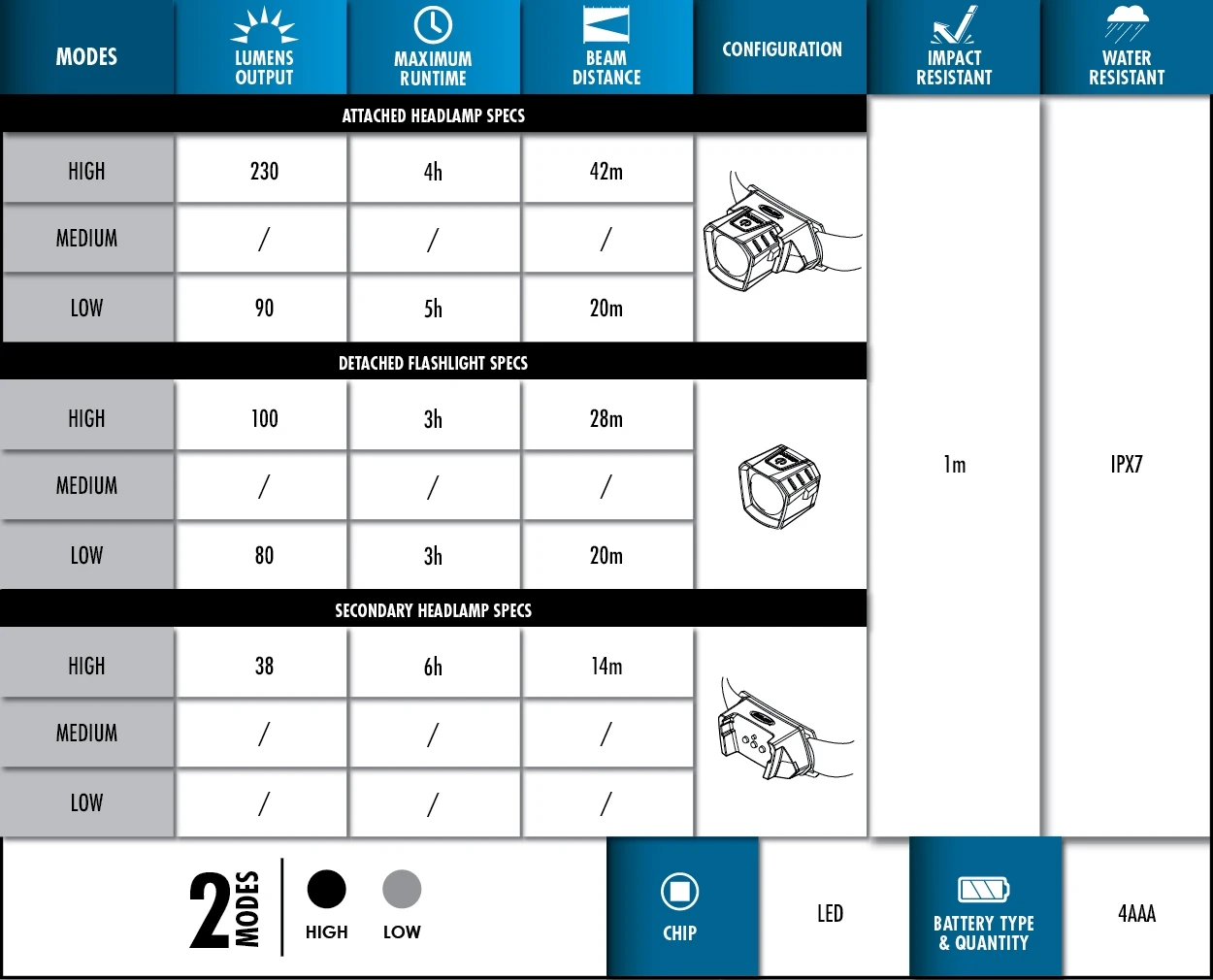 230 LUMENS/42 M BEAM DISTANCE/4 HR RUNTIME