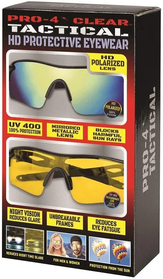 The Pro-4 Tactical CLEAR VISION HD Protective Eyewear provide shock-, impact-, and scratch-resistance; a clear field of vision; elimination of glare; nearly 100% blockage of harmful sun rays; virtually unbreakable frames; and amazing clarity of vision day or night.