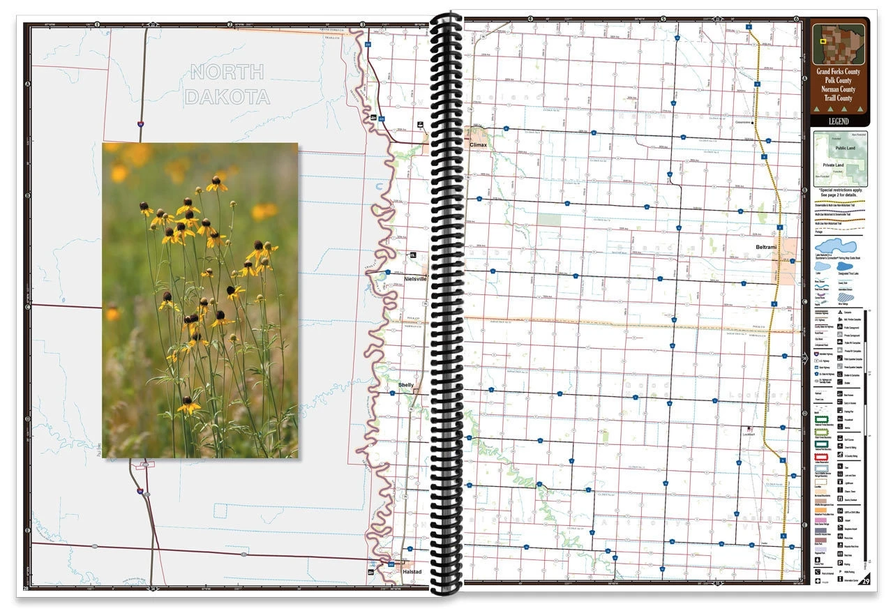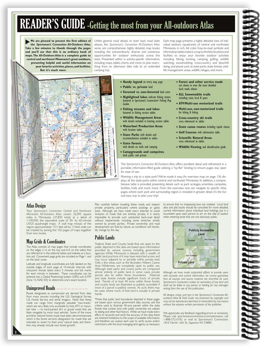 The Central & Northwest Minnesota All-Outdoors Atlas contains beautiful, full-color maps at twice the scale of other regional atlases, which means double the detail, and 100 times the information through informative charts, tables and helpful editorial for all your favorite outdoor activities including fishing, hunting, camping, hiking, biking, off-roading, paddling, skiing, golfing and wildlife viewing. This large format, 15.5 x 11”, 160-page, spiral bound, full-color book is your complete guide to all of the outdoor activities in the area with unmatched information including public land boundaries, wildlife management and other hunting areas, designated use areas, access to streams and lakes, designated trout fisheries, public and private camping locations, state parks, state and national forests, snowmobile, off-roading, biking, hiking and skiing trails, canoe routes, wildlife viewing destinations, scenic drives, golf courses and virtually anything and everything this region’s great outdoors has to offer! This unrivaled level of detail is made possible by splitting the state up into three regions. If you are serious about your outdoors and want to spend more time doing and less time pondering, this is an absolute must-have addition to your reference library!