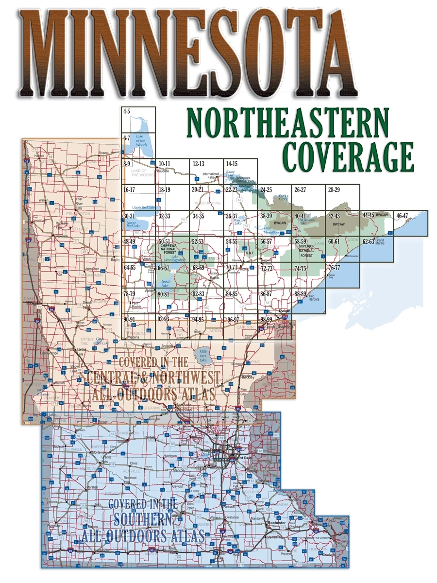 The Northeastern Minnesota All-Outdoors Atlas contains beautiful, full-color maps at twice the scale of other regional atlases, which means double the detail, and 100 times the information through informative charts, tables and helpful editorial for all your favorite outdoor activities including fishing, hunting, camping, hiking, biking, off-roading, paddling, skiing, golfing and wildlife viewing, plus special sections on The Boundary Waters Canoe Area Wilderness and Voyageurs National Park. This large format, 15.5 x 11’, 160-page, spiral bound, full-color book is your complete guide to all of the outdoor activities in the area with unmatched information including public land boundaries, wildlife management and other hunting areas, designated use areas, access to streams and lakes, designated trout fisheries, public and private camping locations, state parks, state and national forests, snowmobile, off-roading, biking, hiking and skiing trails, canoe routes, wildlife viewing destinations, scenic drives, golf courses and virtually anything and everything this region’s great outdoors has to offer! This unrivaled level of detail is made possible by splitting the state up into three regions. If you are serious about your outdoors and want to spend more time doing and less time pondering, this is an absolute must-have addition to your reference library!