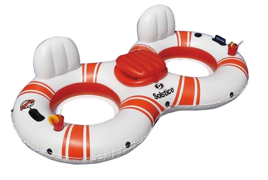 Enjoy all the fun features of an inflatable tube with a friend. The Swimline Solstice Super Chill River Tube Double with Cooler includes two mesh seats with a sturdy back. For extra comfort, this float has two cup holders and a centrally located cooler.