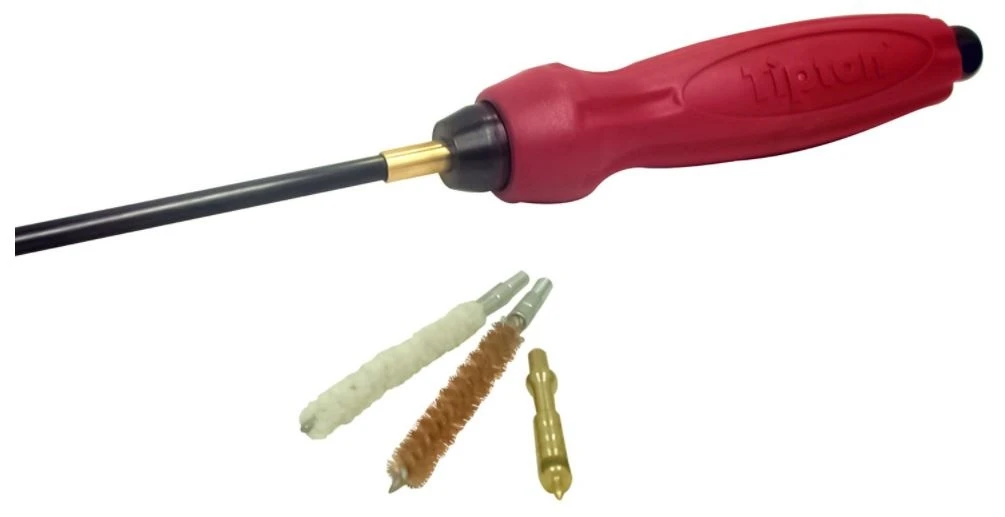 The Tipton Deluxe 1-Piece Carbon Fiber Cleaning Rod 27-45 Cal. 36 inches retail pack well-suited to the tough tasks assigned to cleaning rods. It combines the best features of stainless steel and coated cleaning rods, then adds valuable properties of its own. Carbon fiber rods are the best of both: the carbon fiber can’t scratch your bore like stainless steel, and they won’t embed like coated rods. Plus, Carbon Fiber rods can be bent to an extreme degree and return to their original straightness. During Operation Iraqi Freedom, US military armorers called on Tipton to provide cleaning rods that would clean service rifles in demanding conditions. It made sense to us: Carbon fiber is an ideal material for cleaning rods. We call these cleaning rods “deluxe” because they feature an ergonomically designed handle that spins on two sets of ball bearings – the result is a cleaning rod that smoothly follows the rifling both pushing and pulling, even while under pressure. The “shank-through” construction also allows the user to apply “reasonable” hammer blows to the end of the cleaning rod to get a tight patch through a bore. Available in four diameters and six lengths to fit most rifles, pistols, and shotguns. Rifle and handgun rods are threaded for 8 to 32 accessories, except 17 caliber and 20 caliber rods which are threaded 5 to 40. Shotgun rods are threaded 5/16 inches to 27.