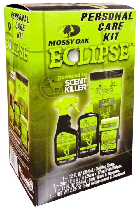 This Personal Care Kit The more steps you take to reduce odors and better your chance of success. This kit is perfect for fighting odor and cleaning up, before, during, and after the hunt. Wildlife Research Center Scent Killer Mossy Oak® Eclipse Personal Care Kit Includes 12 FL OZ Clothing Spray, 24 Count Field Wipes, 12 FL OZ Body Wash & Shampoo, and 2.25 OZ Antiperspirant & Deodorant.